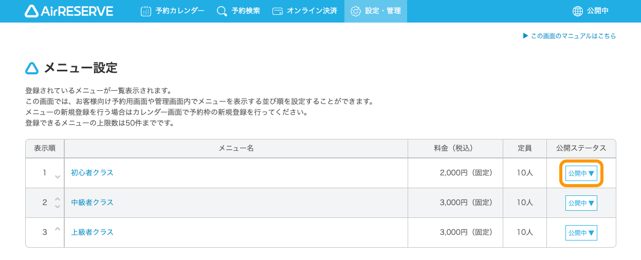 「メニュー設定」画面で、非公開にしたいメニューの「公開ステータス」欄をクリックします。