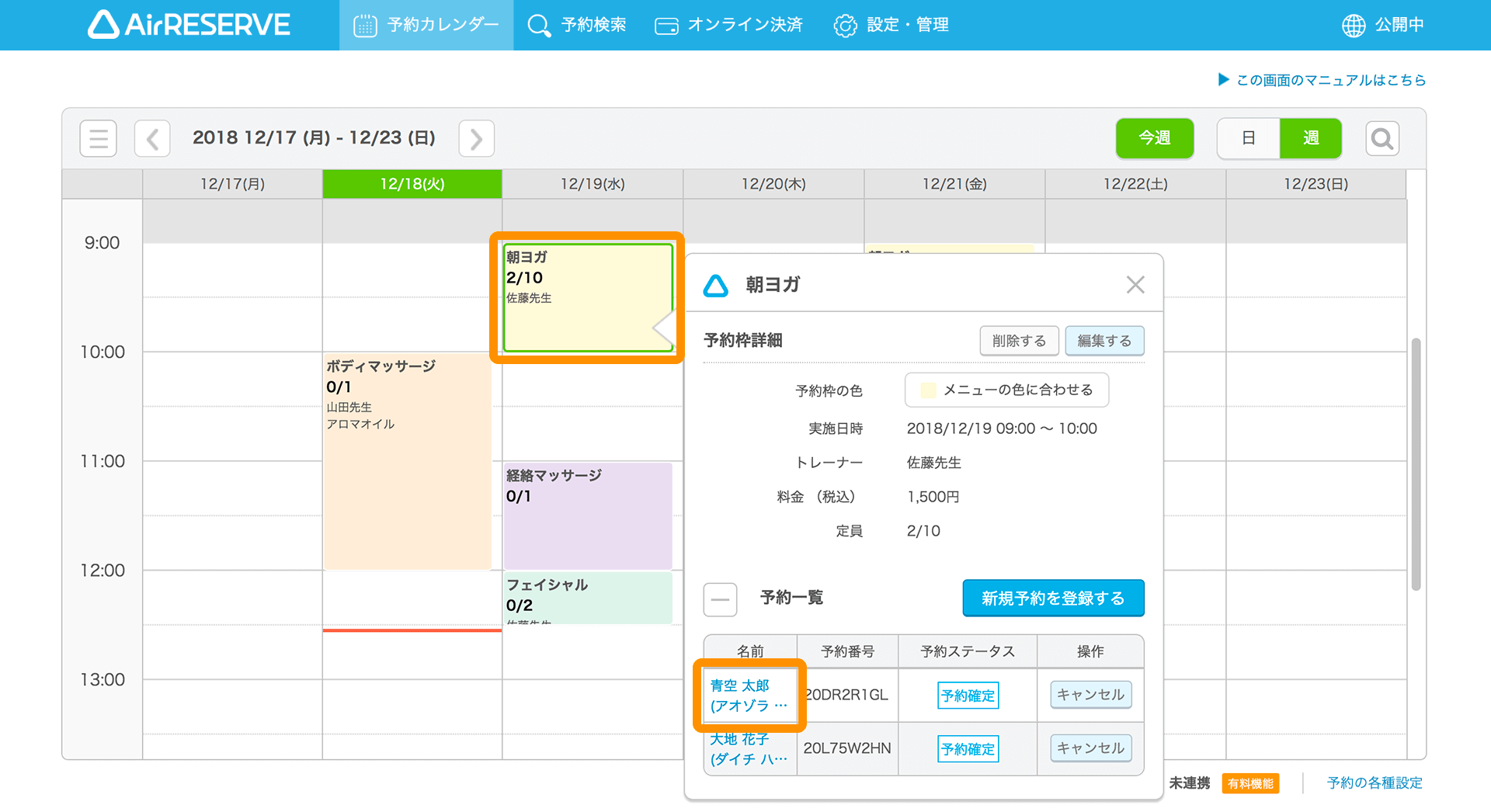 「予約カレンダー」から、 該当の予約枠をクリックして「予約枠詳細」を開き、「予約一覧」から、変更したい予約の「名前」をクリックします。