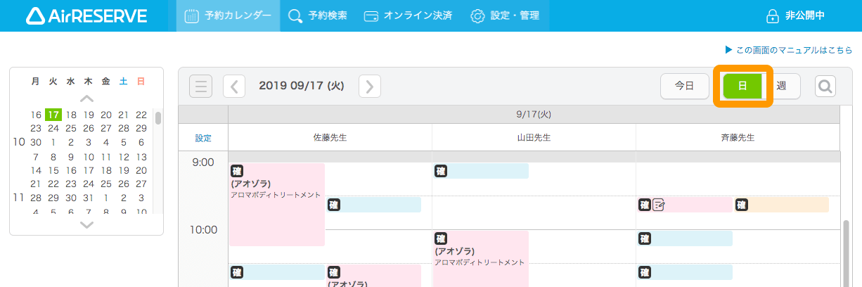 予約カレンダーの表示設定が「日」単位になっているか確認します。