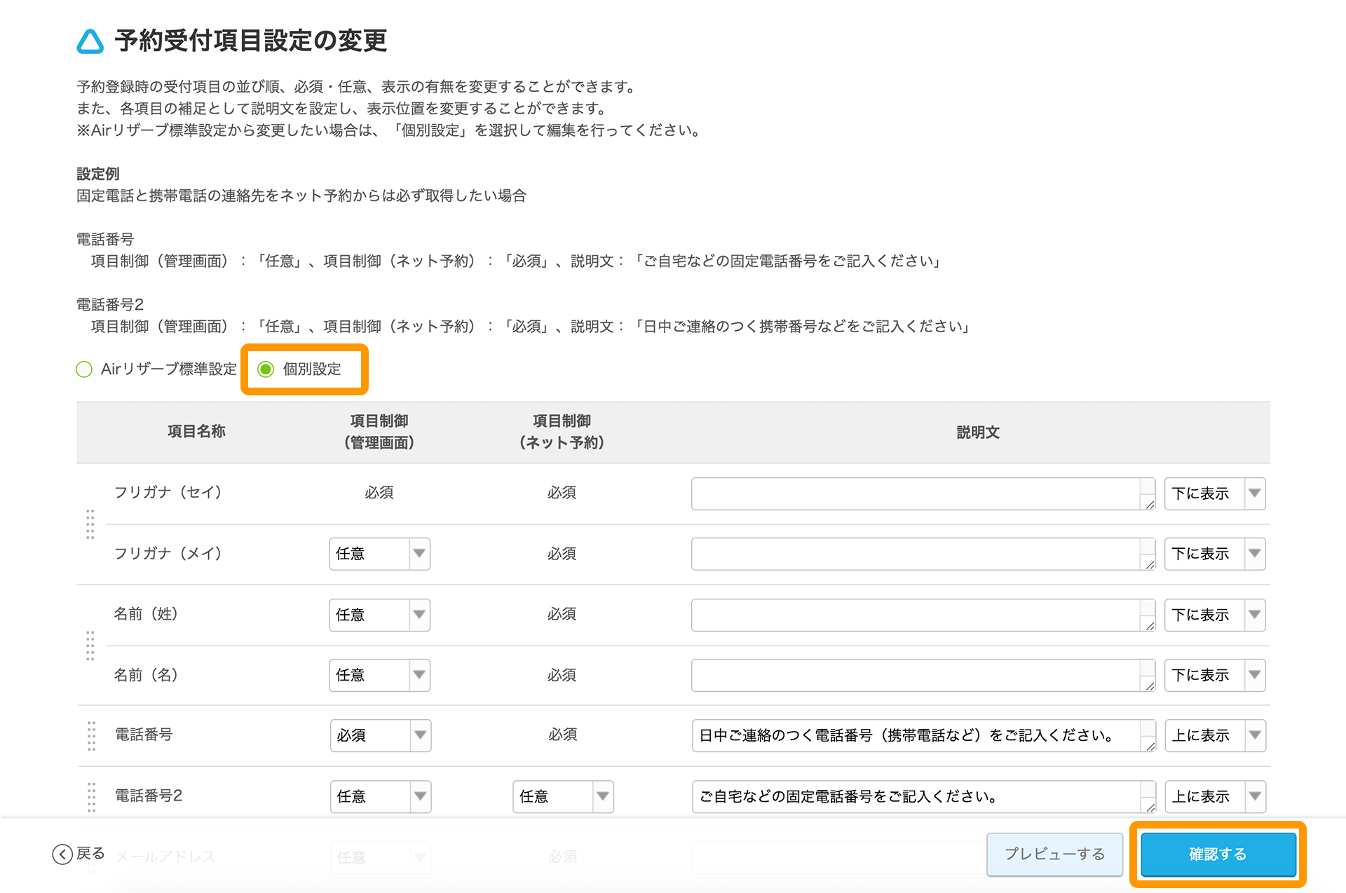 「個別設定」で予約受付項目設定を変更した後でも「Airリザーブ標準設定」を選択することで初期状態に戻せます。